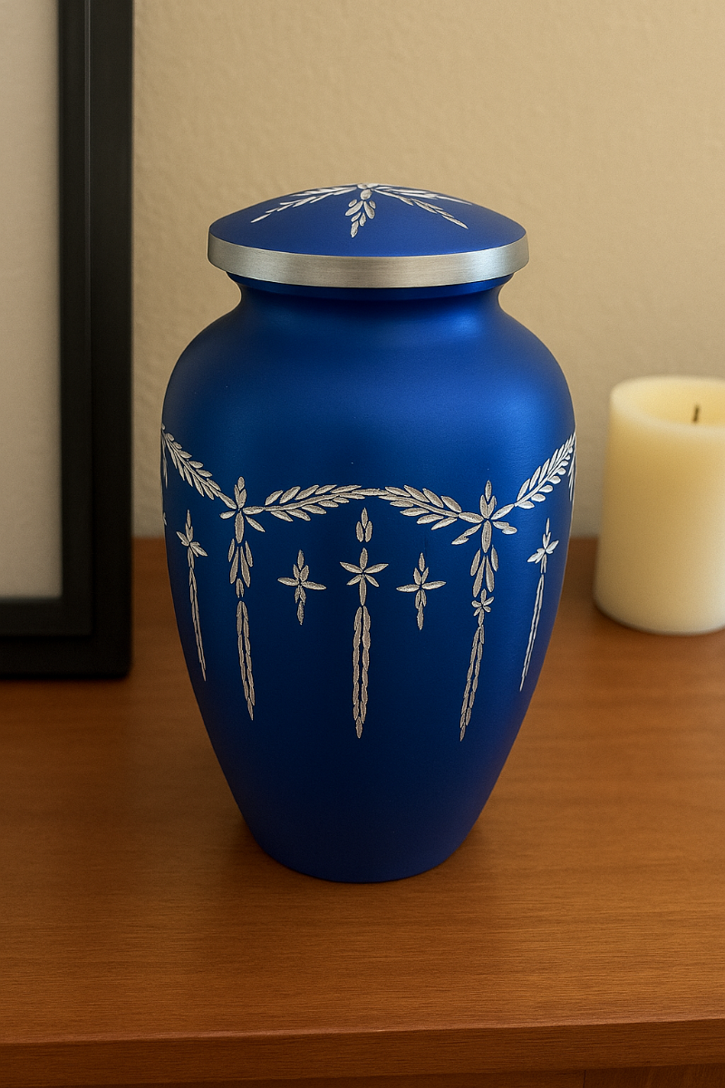 Honor your loved one with the Adult Blue Shimmer Diamond Cut β€” a beautifully crafted metal cremation urn designed to provide a dignified and lasting tribute. Made from high-quality metals, this urn offers a timeless aesthetic that complements any memorial setting. Whether displayed at home, placed in a columbarium niche, or used for burial, it provides a meaningful resting place that reflects the care and love you have for those you've lost.